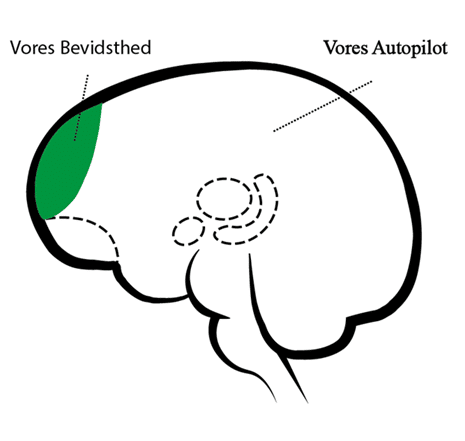 Resten af hjernen fungerer som en autopilot. Vi har meget glæde af autopiloten, for den gør, at vi kan udrette alt det vi kan. Fx cykle og spise, og tale samtidig. Det er også den der er årsag til at du gør det samme hver aften, når du skal i seng.